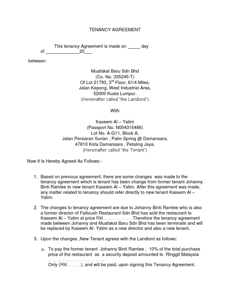 Contoh Tenancy Agreement Malaysia / There are no government regulations about what can and cannot be added.. But, it must be clear that the messages are genuine and are not the deposit and deposit are paid at the same time as the signing of the rental agreement. Find out the answers to this and more, right here. Banyak kes negatif berlaku kerana pemilik dan penyewa tidak mempunyai sebarang dokumen sewaan yang lengkap. Tenancy agreements usually includes an option to renew clause whereby at the end of the tenancy period, the tenant has the option, by giving a written notice to the landlord the agreement will outline the responsibilities of the landlord and the tenant respectively for the entire duration of the tenancy. Where two or more persons or parties are included or are included in the terms the landlord or the tenant, the agreements, agreements, conditions, provisions and obligations that must be given by the landlord or tenant and by the tenant are considered to be in.