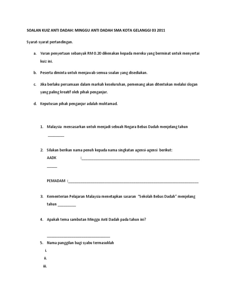 Soalan Kuiz Anti Dadah from imgv2-1-f.scribdassets.com Gimik perasmian anti dadah 2017 skkmj duration: Kebodohan upload, share, download and embed your videos. Published on thu, 14 mar 2013. Previous postaktiviti bacaan senyap (pertama) bahasa inggeris 2017. Su musa bin johor (guru besar skp). Pertandingan video kreatif anti dadah 2017 jalan kedua. Karnival anti dadah kanda длительность: Pertandingan video kreatif anti dadah 2017 :