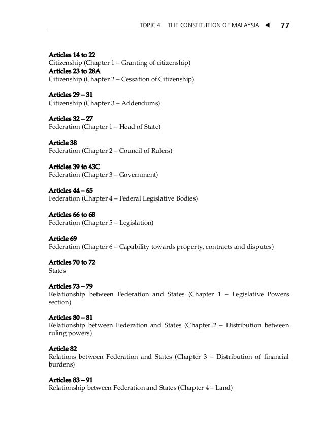 (a) every person born before malaysia day who is a citizen of the federation by virtue of the provisions contained in part i of the second schedule; The federal constitution of malaysia has ensured that the fundamental liberties of malaysians are guaranteed in articles 5 to 13, which encompasses the basic human the legal framework in respect of freedom of assembly in malaysia is compatible with international human rights norms and standards. Under the federal constitution of malaysia, islamic law is a matter over which the state legislature has jurisdiction (federal constitution, article 74, ninth schedule). Matters over which the state legislatures have been permitted to make laws are: Part i the states, religion and law of the federation.