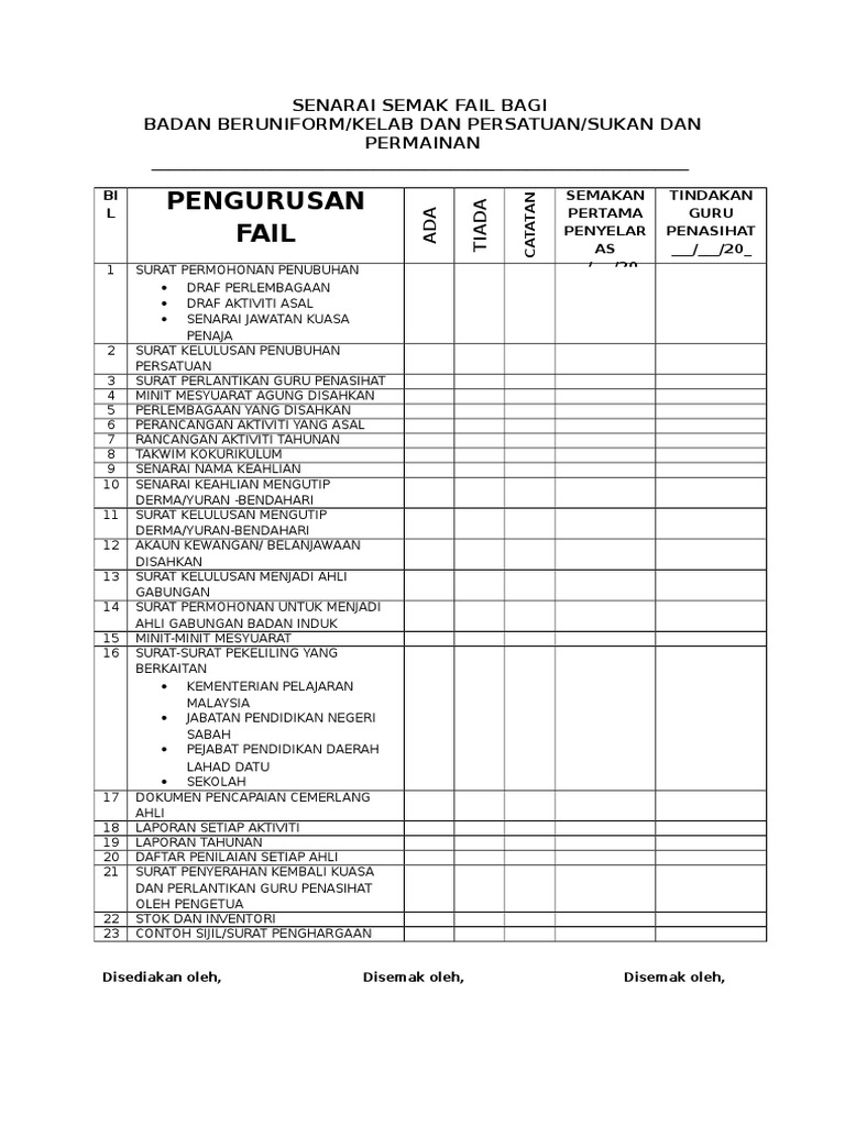 Sistem Fail Unit Kurikulum from imgv2-1-f.scribdassets.com Sebagai seorang guru penasihat dalam melaksanakan aktiviti kokurikulum, guru tersebut perlu menyediakan fail penasihat yang lengkap untuk memastikan aktiviti kokurikulum dapat dirancang dan dilaksanakan dengan lancar sepanjang tahun. Berikut merupakan senarai semak penyediaan fail. Asas fail meja adalah senarai tugas dan tanggungjawab seseorang individu dalam pejabat/jabatan. Borang senarai semak permohonan cuti belajar borang senarai semak permohonan cuti belajar akademik universiti. Berikut ialah senarai semak dokumen untuk pemantauan bersepadu dari kpm, jpn atau ppd. Mempertingkatkan pengurusan kurikulum supaya sistematik dan berkesan. Senarai semak fail unit kokurikulum. Fail semua panitia mata pelajaran 19.