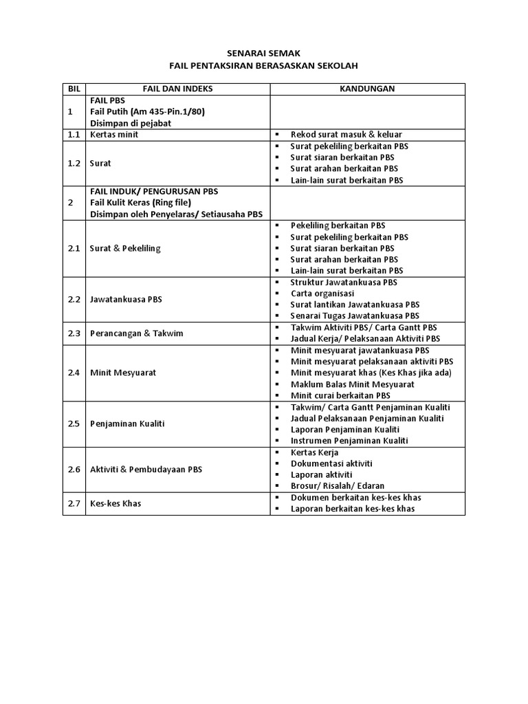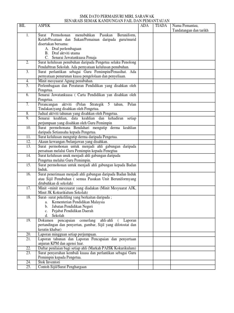 2015 senarai semak fail pengurusan kokurikulum mp3 & mp4. Berikut ialah senarai semak dokumen untuk pemantauan bersepadu dari kpm, jpn atau ppd. Guru penasihat 3 minit mesyuarat agung unit 4 senarai jawatankuasa yang disahkan oleh gb 5 carta organisasi guru 6 carta organisasi murid 7 takwim aktiviti. Demikianlah artikel senarai semak lengkap fail kurikulum sekolah. 28 october 20192 december 2019 red linda 47 comments.